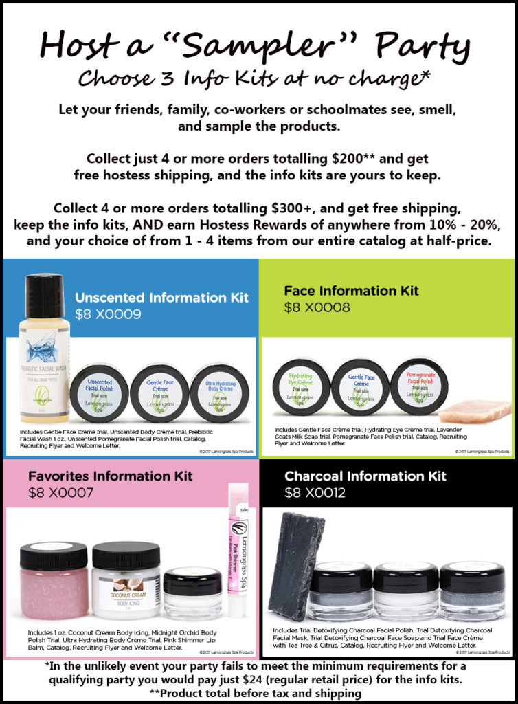 Sampler or Catalog party – Those who live too far to have a basket or mini-basket delivered can host a Sampler or Catalog party. We provide you with a few samples, catalogs and order forms, you collect the orders, and return them to us. This type of party can also be combined with a Facebook party for maximum rewards.
